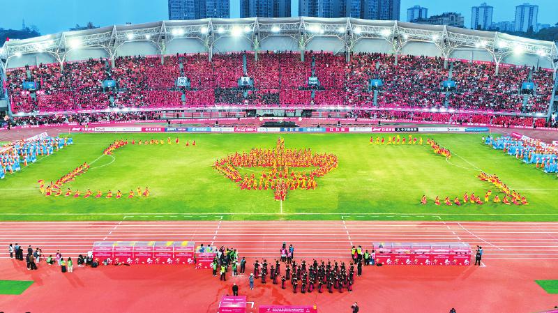 伴随激昂的音乐,学生们身着火红服装迅速就位。他们手持道具,在光影交错间变幻出层层叠叠的灯阵造型,动作整齐划一、刚柔并济,表情自
