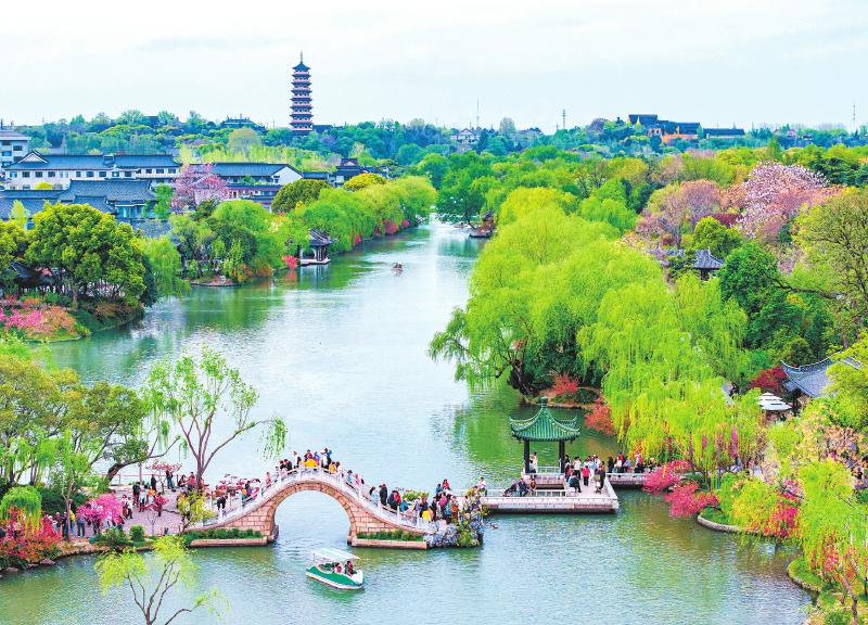 4月7日,游客在江苏省扬州市瘦西湖风景区游览(无人机照片)。
