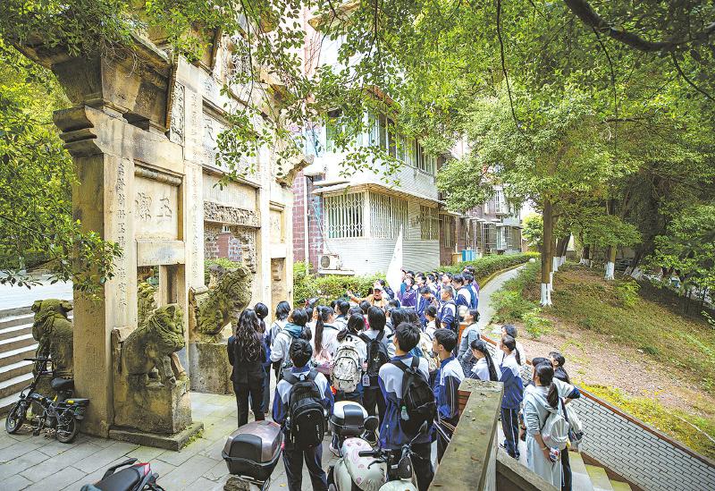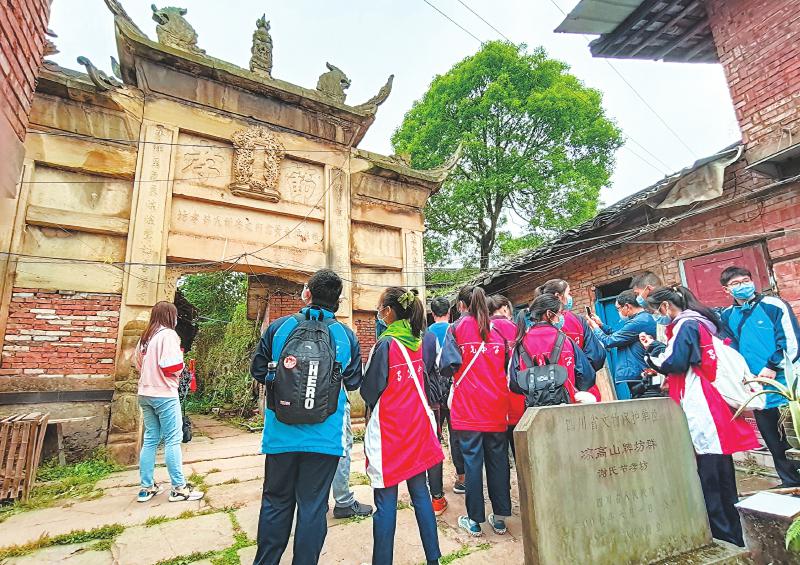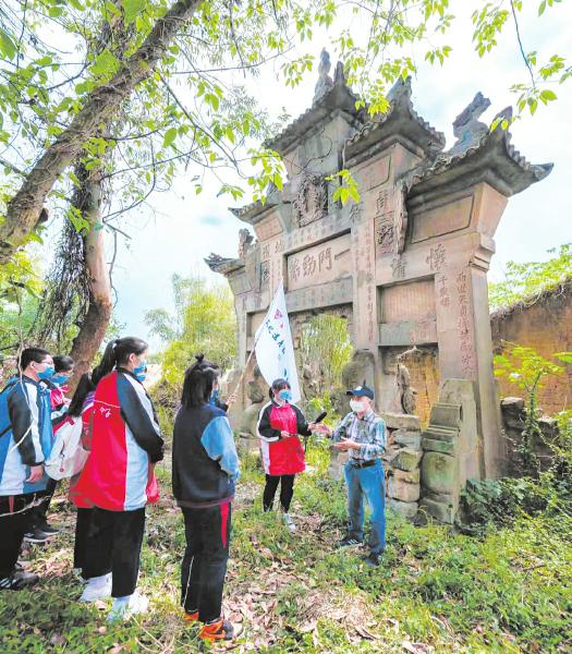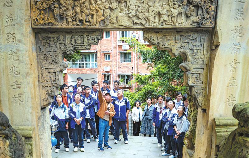 宋光辉给学生们讲宋氏节孝坊 自贡融媒记者 叶卫东 摄